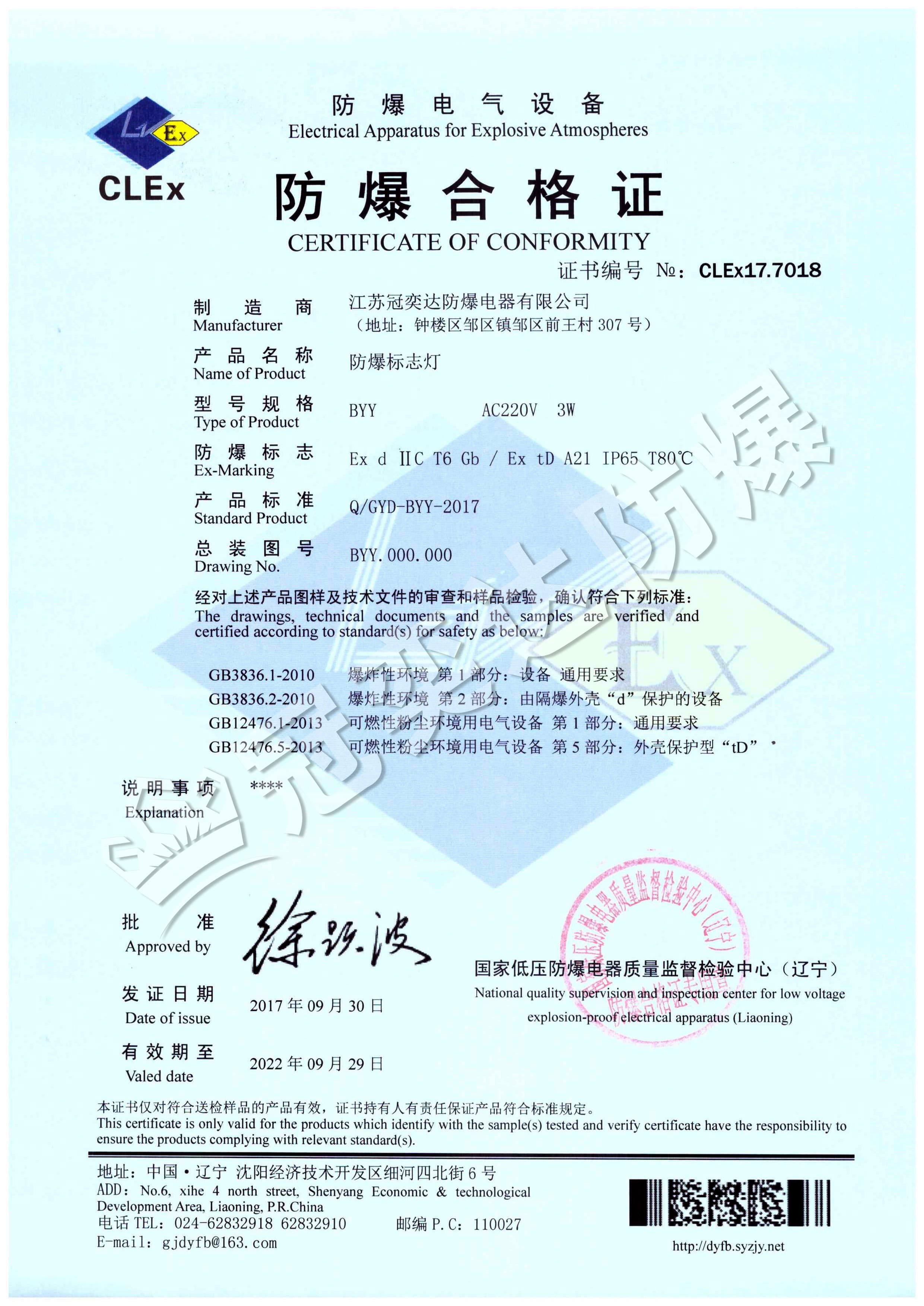BYY防爆標(biāo)志燈合格證