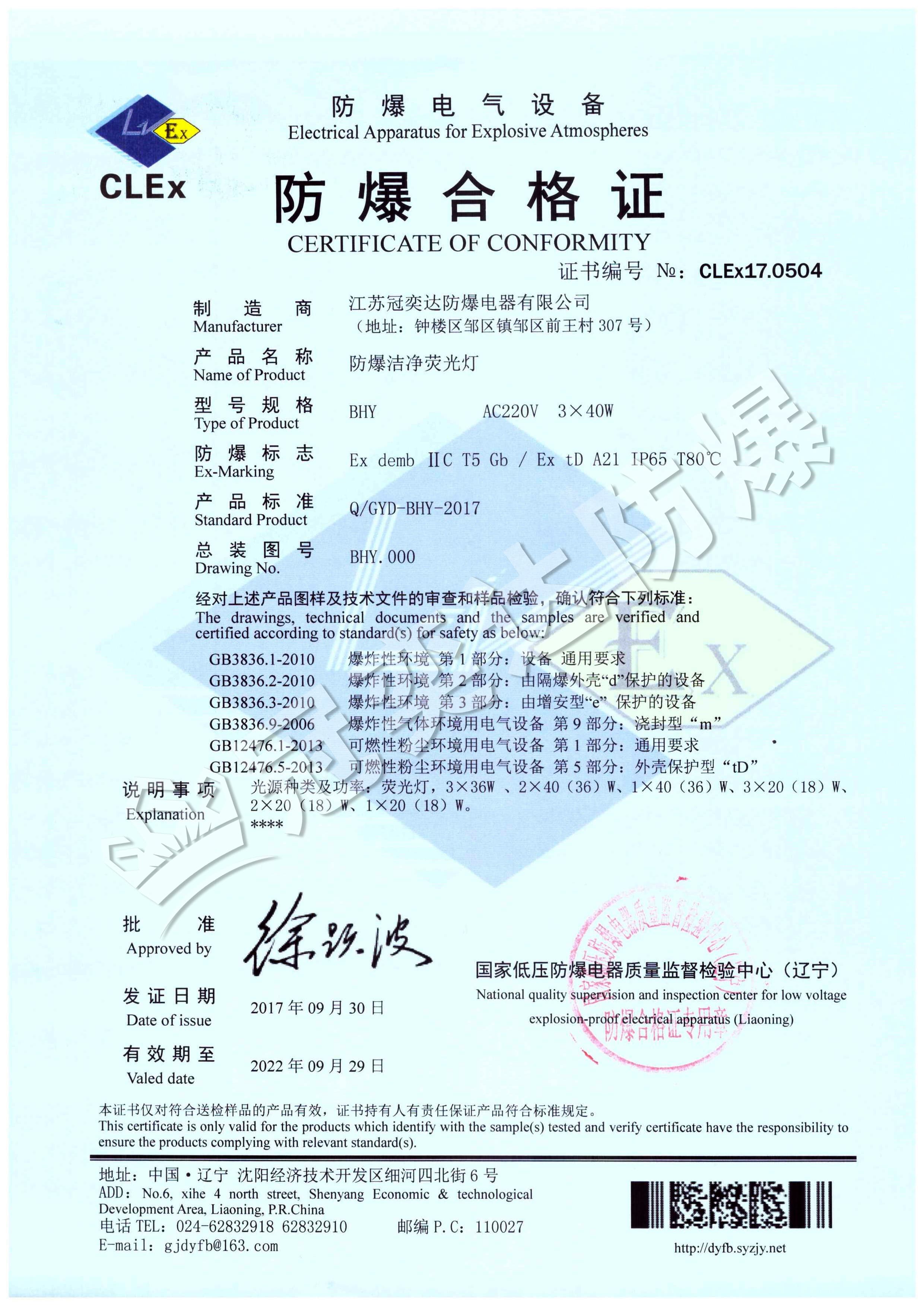 BHY防爆潔凈熒光燈合格證